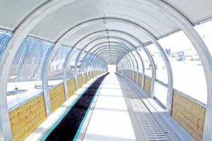 Los paneles de madera en la parte baja lateral crean una sensación de espacio suave y placentera. Se instalaron puertas eléctricas enrollables en la entrada y salida. También se instalaron cada 15 m puertas de emergencia laterales de cristal.